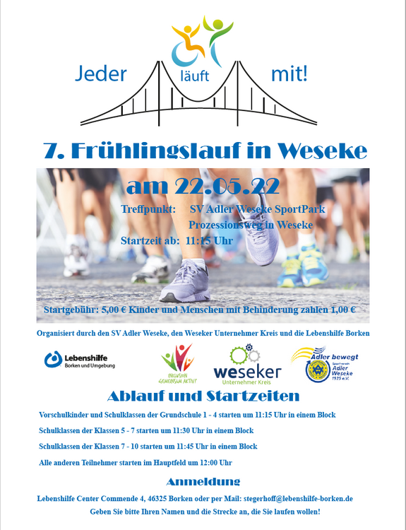 Mit dem Adler Weseke, dem Weseker Unternehmerkreis und der Initiative Inklusiv Leben in Borken, organisieren wir in diesem Jahr den Frühlingslauf in Weseke.